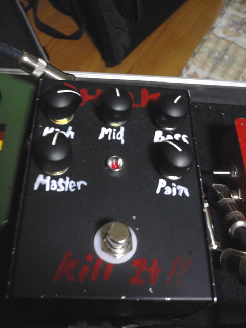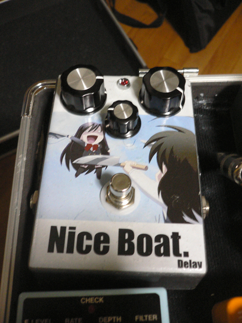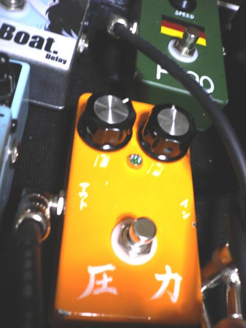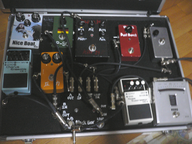 うなぎの蒲焼日記自作ネタとか音楽ネタとか2008.04.28 Mon 03:13:55 ご無沙汰でした久々の更新ですが、仕様です。 いろいろと、やっていたんですが全部記事にすると、ギターを練習する時間が無くなってしまうので、出来てません。 5/5に京都MOJOというライブハウスにて行われる"Metal Passion Vol 3"というMetalバンドのみのライブイベントに出演するので、練習しないと、ホントまずい状況なので……。 ウチのバンドは、今回はArch Enemyのコピーバンドとして出ます。オリジナル曲がまだ完成していないのでね。 自分以外のメンバーが、全員暦1年経ったところなので(平均年齢19.6歳です)まだまだ未熟です。真剣に取り組んだ1年なので、そこらの暦1年には負けてないと思いますが。 さて、何かしら紹介しましょうか。 エフェクトボードの中身でも紹介しましょう。接続順です。 これは、松美庵さんのサイトの製作記事を見て作りました。 製品は、3万近くするらしいですが、作れば数千円です。どっちが良いかはその人次第。 非常に簡単で、製作は1時間程度で出来ました。しかし、効果は絶大です。自分の場合は、エフェクトボードの入り口として、入力バッファとして使用してます。 知人に、ストラト→TS9のブースターとして試して貰ったところ、こいつを入れるだけでもの凄く元気のある、いいオーバードライブになってました。 自分のやってるバンドでは、ストラト→TS9という組み合わせはまず考えられないので(自分の趣味では、やるけどね。)、聴いてて面白かった。 骨太のブルース、ロック、ハードロックを演りたくなるような音でした。 KORGのチューナーです。踏みやすい、見やすい、デザインが良いと三拍子揃ってます。 True Bypassでないことだけが、欠点でしょうか。でも、そこまで神経質になる必要もないかな? と思い、特に改造はしていません。 気になるようになったら、手を加えようかなぁ。 Metalバンドのギタリストは、必然的にノイズとの戦いになりますよね。 そんなあなた達の心強い味方がコイツです。 手を加えたのは、中の信号線をWEに変えたぐらいです。気持ちの問題です。 手でギター弾きながら、足でエフェクタを次々と切り替えられるほど、自分は器用じゃありません。自分、武器用ですから。ウェポン。 クリーントーンは、コンプ+コーラスで、歪はKrankのDist、ソロの時にブースター+イコライザを踏みたい。でも、足の動きは最小限にという、自分の横着心から生まれたものです。 4回路2接点のスイッチと、3回路2接点のスイッチ、マーシャル風のジャック、眩しいぐらい明るい赤⇔青のLED、赤のLED、WEの配線材から出来ています。回路は、自分の希望が叶うように適当に考えました。True Bypassで。 これも、松美庵さんのサイトの製作記事を見て作りました。 自分のサイトに製作記事書いてあるんで詳細は割愛。 あれから、ダイオードクリッパ切り替えSWを増設。確か、1N4148とLEDだったかなぁ。ゲルマとLEDだったかも。 これをブースターとして使うのは何だか間違っている気がしている。これだけで十分歪むし、Krankの前にブースターとして入れてもあんまり効果ないんだよね。 自作TS9もどきをブースターにしたら、いい感じだったけどそれはギターの相方に貸し出し中なので、こいつをブースターにしたまま。 何だかんだで、かなりお気に入りのエフェクタです。可愛いし。 出た!! バケモノが!! コイツなしには、スタジオ入れません。 JC-120だろうが、JCM800だろうが、JCM2000だろうが、そんなの関係ねぇ! ってな具合にハイゲインアンプに変えてしまう魔法の小箱。 アンプ側のトレブル、ミッド、ベースをいじってやるだけで、多彩な音が出るんだよね。もちろん、エフェクタ側でも調整するけど。 ちなみに、ウチのバンドのギター二人ともこれ自作して、メインの歪みにしてます。 ダイナコンプはありきたり。オレンジスクイーザーは前に作った(基板組んでテストしただけ)。 じゃあ、他人があんまり作ってないコンプを作ろう、ってことで作りました。 なかなかいい具合に圧縮してくれます。コイツがあるかないかで、コーラスの綺麗さがガクっと変わりますガクっと。 Arch Enemyのクリーントーンにはコーラスが憑き物、じゃなくて付き物だなと言う理由で購入。 これも、信号線をWEに変えてありますが、やっぱり気持ちの問題です。 さすがBOSS、期待を裏切らない性能です。 これは、大阪日本橋にある、デジットという電子パーツ屋さんが出している、自作エフェクタキットなのです。基板とパーツセットで、確か2240円でした。格安で良いものが作れるので、オススメです。 デザインは、アホなデザインですが仕様です。Rebote Delay→Nice Boat. Delayという発想です。 飛び道具的にも使えるし、リバーブ的な使い方も出来る便利な一台。ここぞという時のソロで踏みます。 ひよこのぺーじ という自作エフェクタサイトで売っているキットです。 安価なキットで、製作がしやすいので助かります。基板とパ